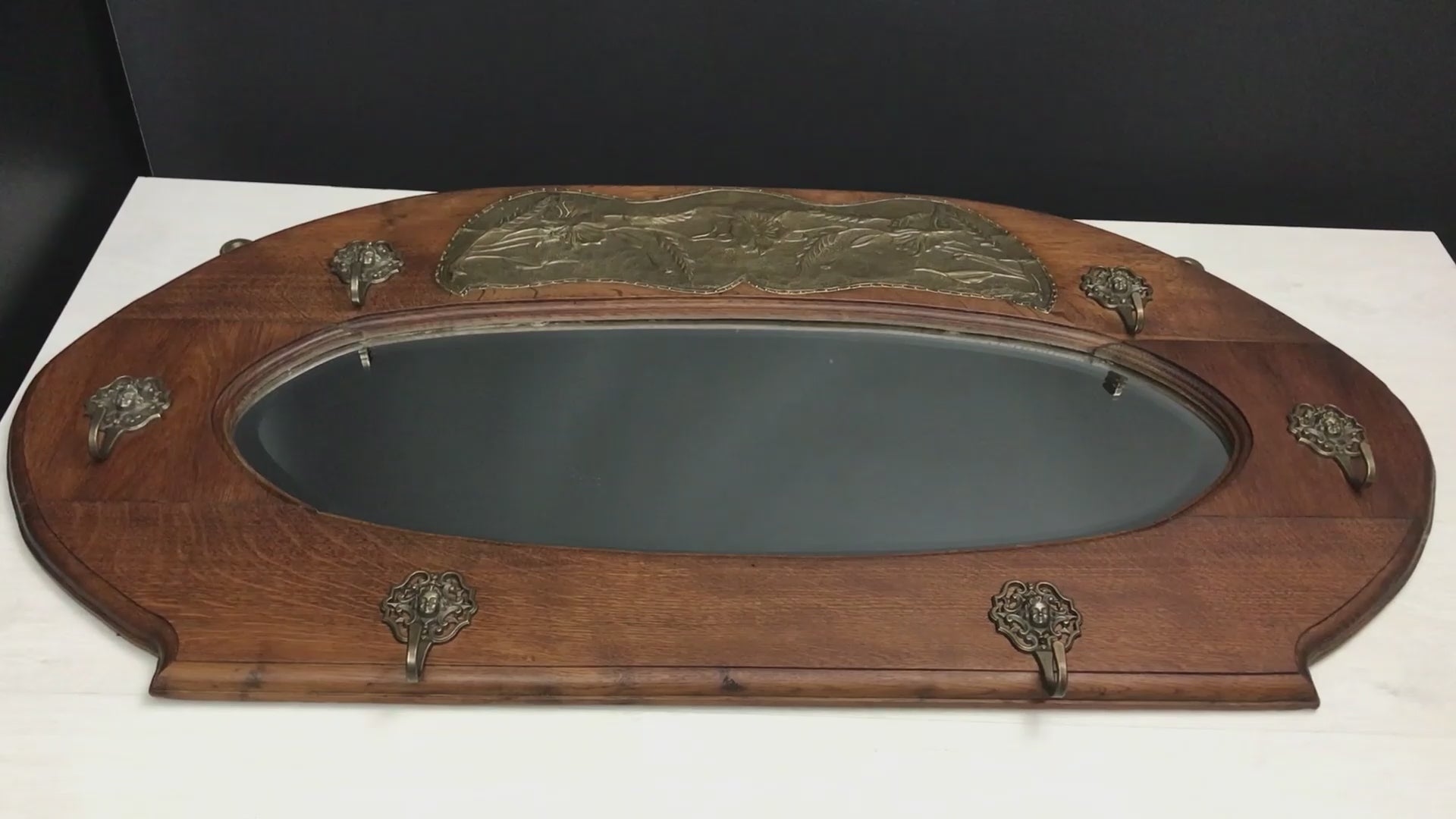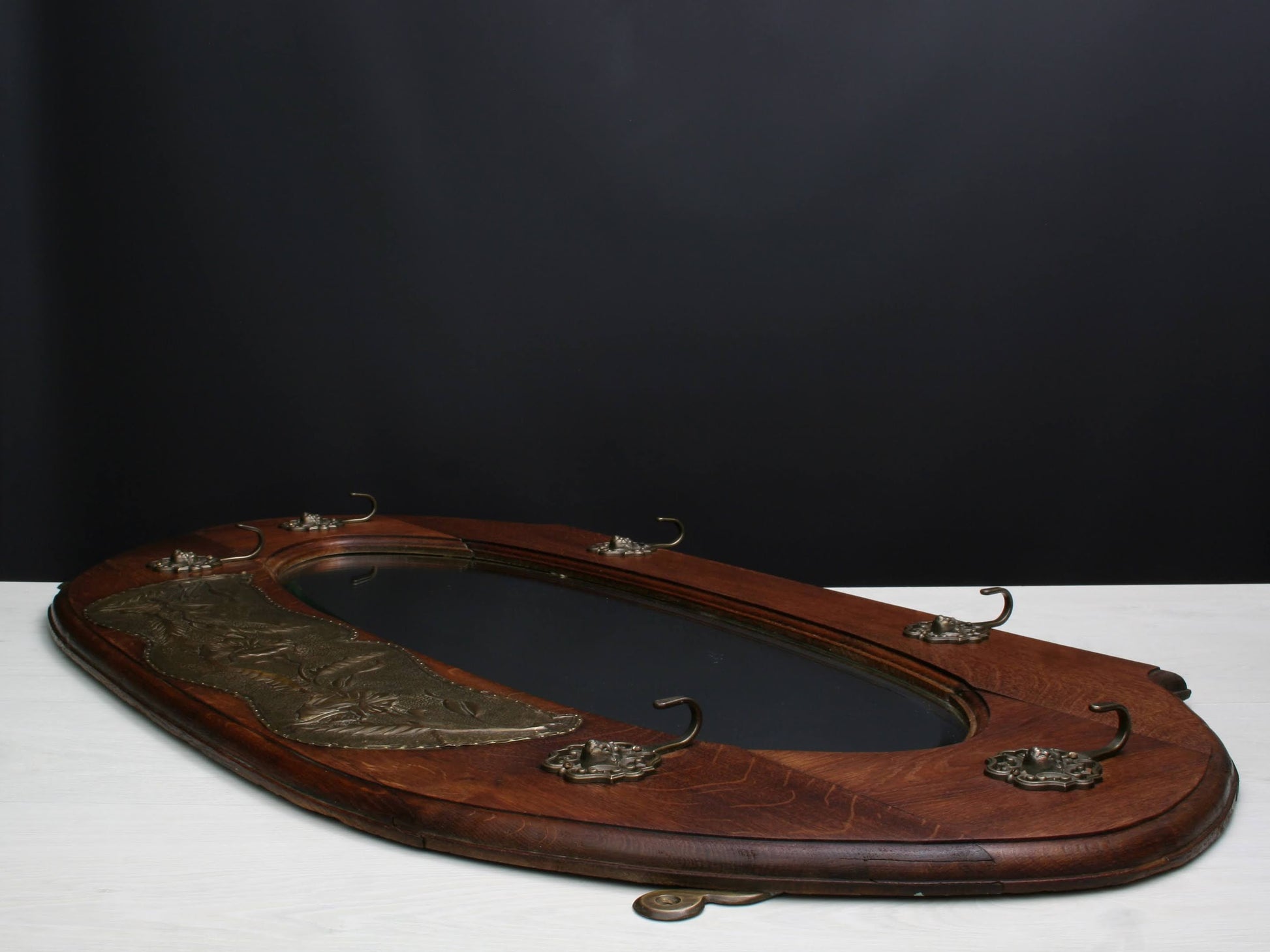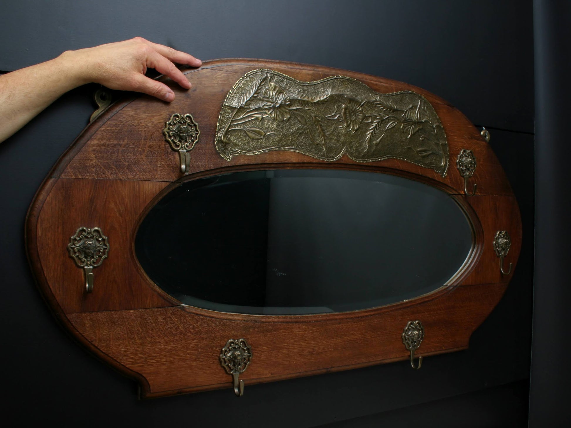 This vintage mirror wall coat rack is a stunning, unique mirror coat rack that's perfect for your modern or vintage home decor. Featuring a large beveled antique mirror set into a solid wood frame, it serves as a functional wall mount coat rack. Curated in Belgium, this piece is an ideal entryway coat rack / entryway mirror, bringing a functional and luxurious touch to any space.