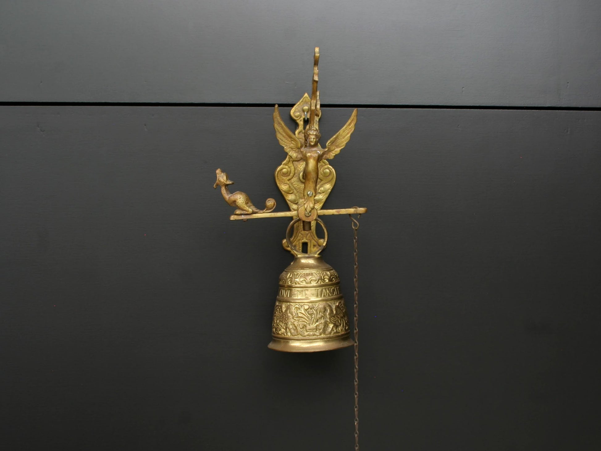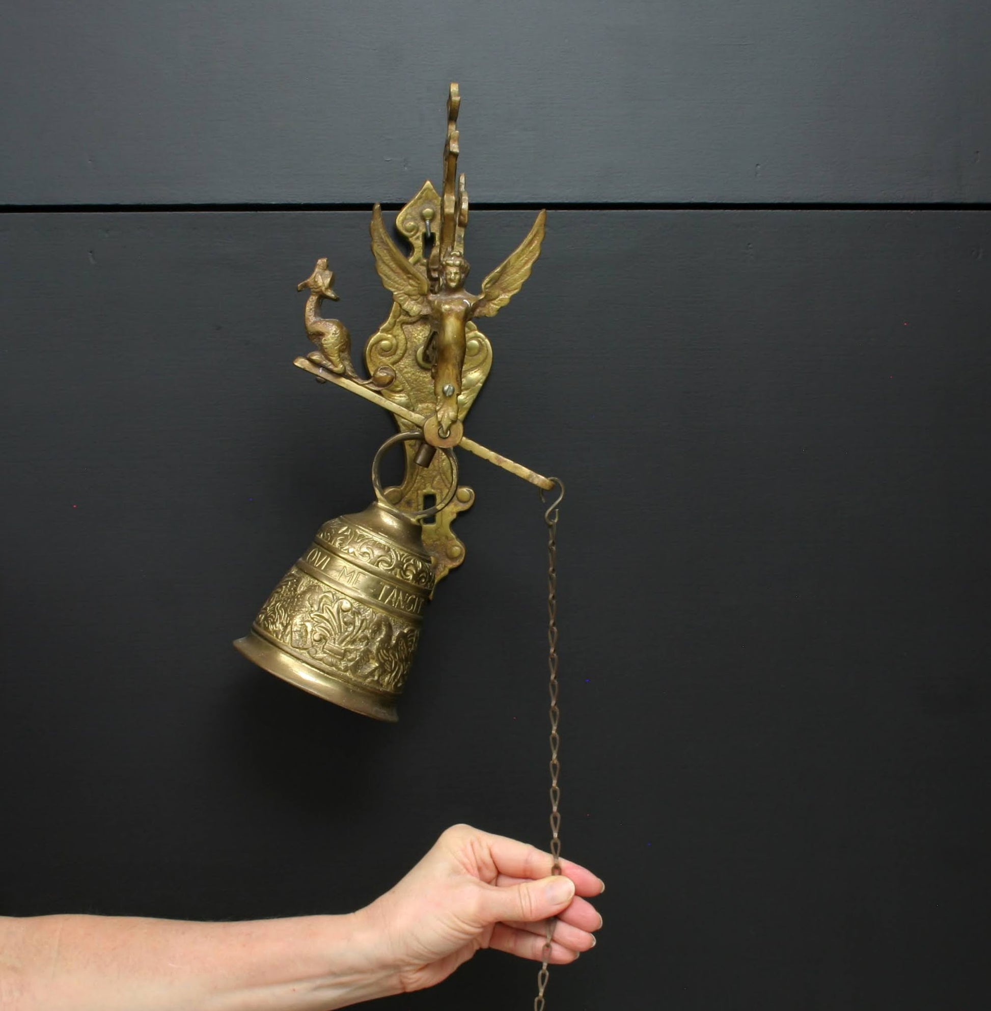 Large bronze or brass bell from a Belgium monastery. A wall mounted bell that is vintage around the early mid century, or possibly antique. In its time of service, it would have been used in the monasteries, or as a church bell and school bell. Nowadays such an impressive bell would complement our modern and French decor, perhaps use as a unique dinner bell or an interesting antique door bell.